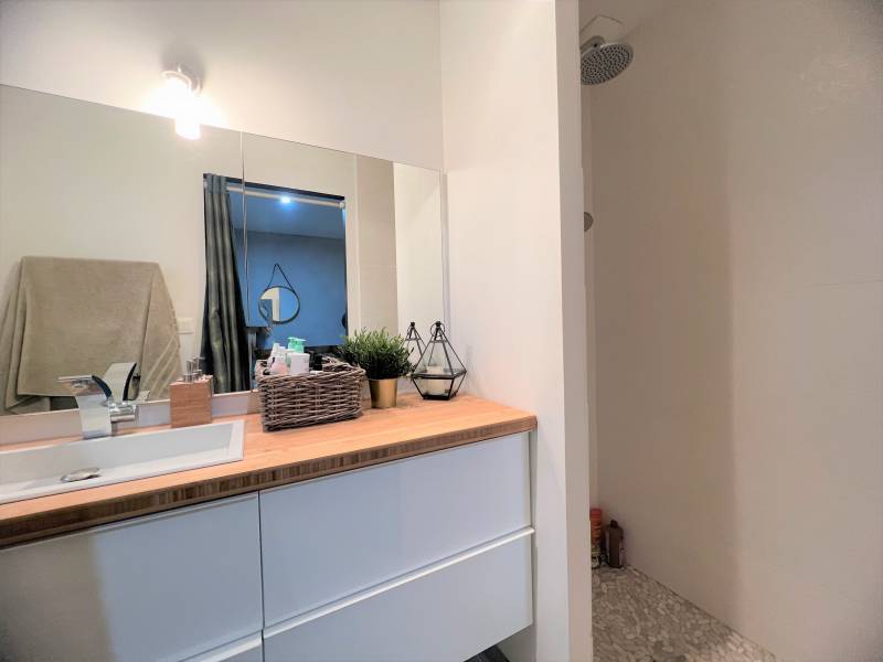 de plain pied, composée d'une entrée avec placards, de 3 chambres (11m², 11.1m², 11.3m²), dont une avec sa salle d'eau, d'une seconde salle d'eau, d'un cellier/buanderie, d'une cuisine entièrement équipée ouverte sur un salon traversant.