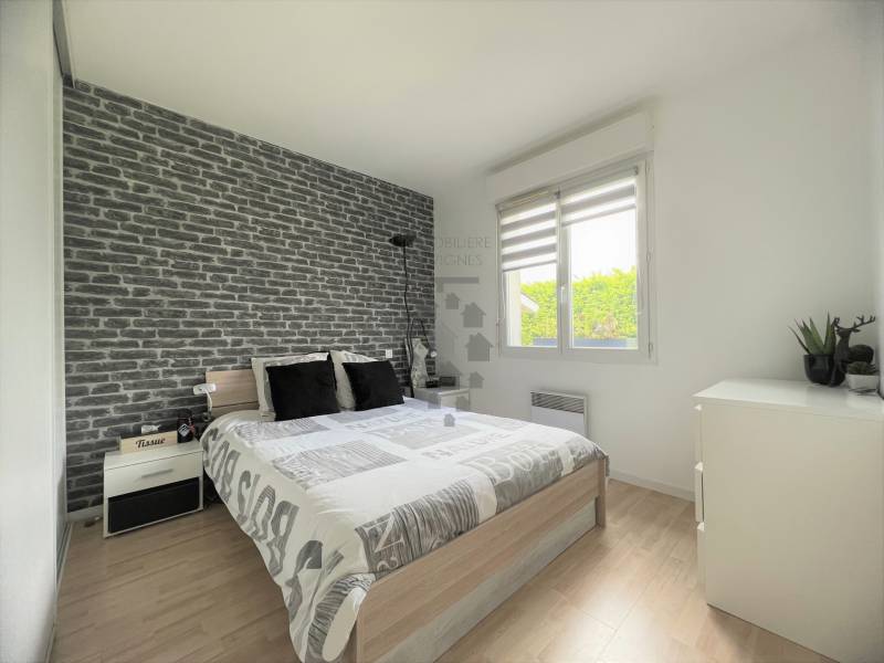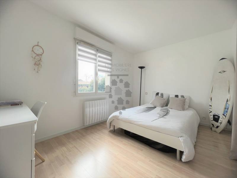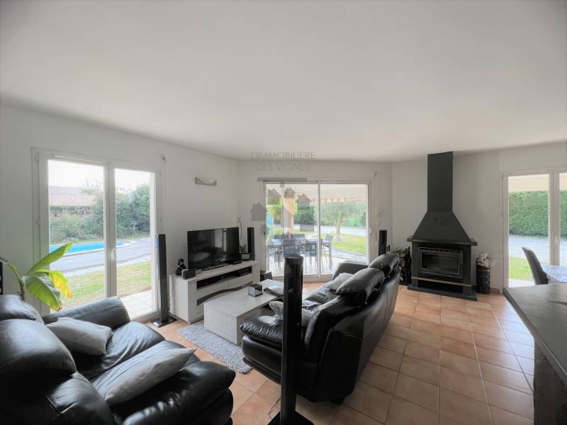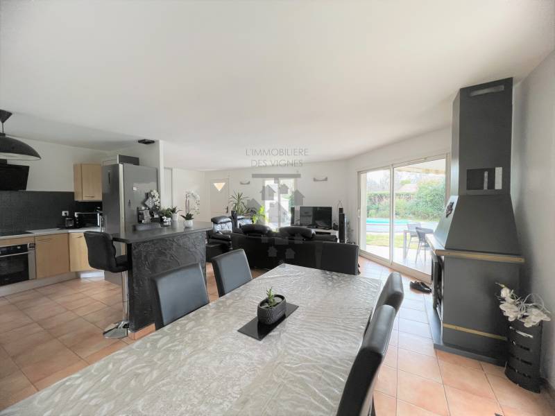 Votre agence indépendante locale, l'Immobilière des Vignes, vous présente, proche des commodités et au calme, dans un bel environnement, cette agréable maison de plain pied, composée de 4 chambres dont une avec son dressing, d'une salle de bains avec douche et baignoire, WC, d'un cellier/buanderie, d'une cuisine ouverte (entiérement équipée) donnant sur un séjour lumineux équipé d'un poêle.