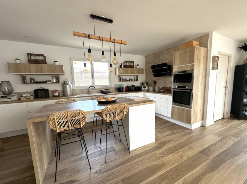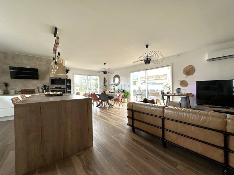 De plain pied, elle est composée de quatre chambres, d'un cellier/buanderie, d'une salle de bains avec wc, d'un wc séparé et d'une cuisine (aménagée et équipée) ouverte sur un beau salon/séjour lumineux (50m²) donnant sur une agréable terrasse en bois d'environ 70 m².