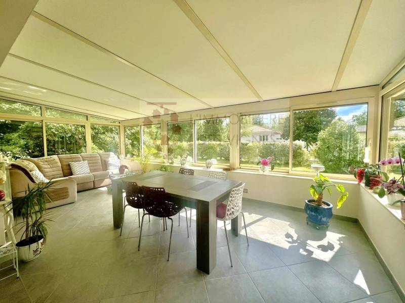 Le rez-de-chaussée comprend deux entrées (invités et service), une cuisine aménagée et équipée, un cellier/buanderie, un WC, une chambre avec salle d'eau privative, ainsi qu’un salon/séjour, équipé d'un insert, prolongé par une véranda chauffée de 25m² et donnant sur une agréable terrasse équipée de stores bannes motorisés.