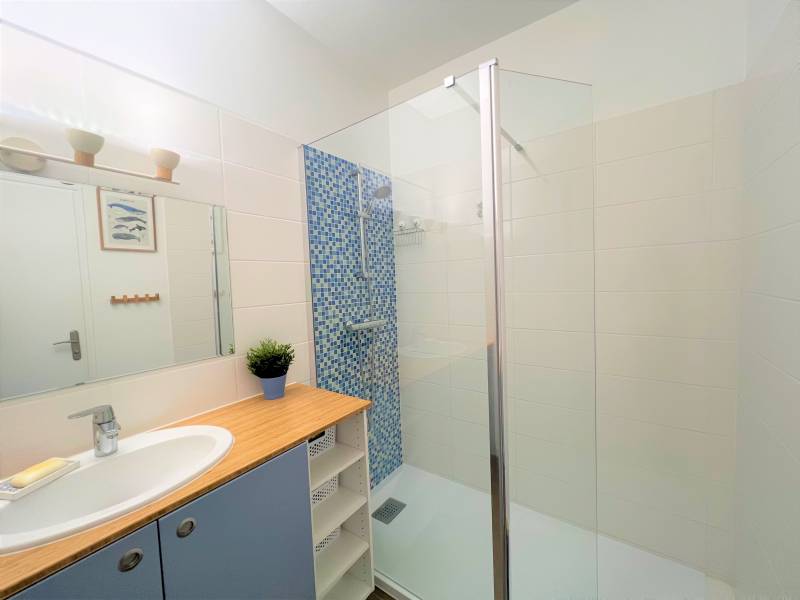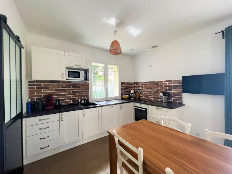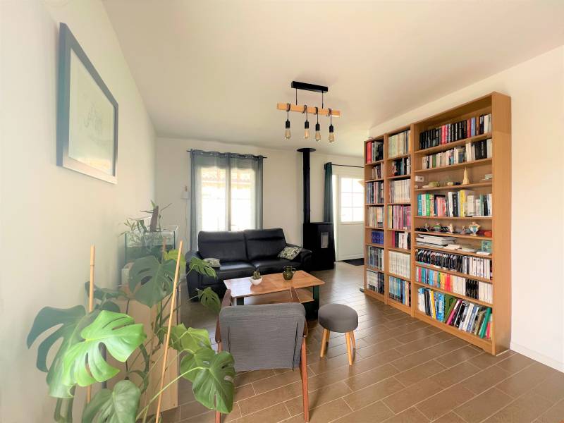 Elle est composée d'une entrée avec placard, de deux chambres avec placard, d'une salle d'eau, d'un WC séparé, d'un cellier/buanderie et d'une cuisine (aménagée et équipée) ouverte sur un salon/séjour lumineux équipée d'un poêle à granules.