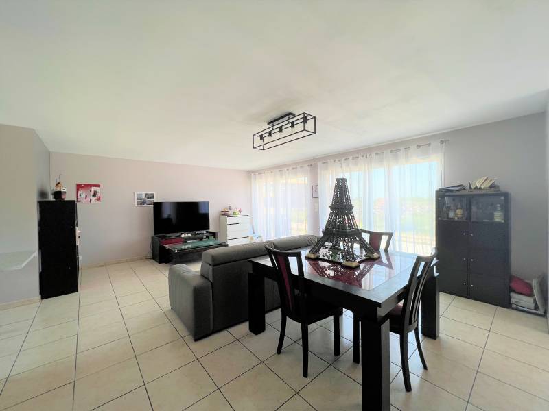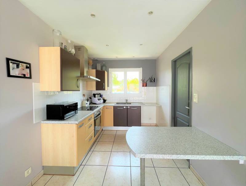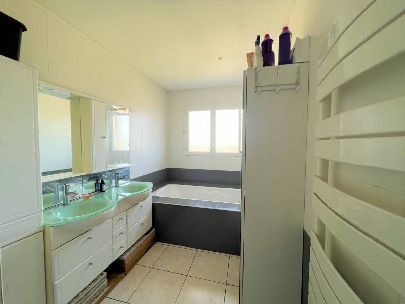 De plain pied, elle est composée d'une entrée, d'une salle de bains (avec douche et baignoire), d'un wc séparé, de 3 chambres dont une avec salle d'eau privative, d'un cellier/buanderie et d'une cuisine ouverte sur un beau salon/séjour lumineux donnant sur une terrasse carrelée, équipée d'un store banne.