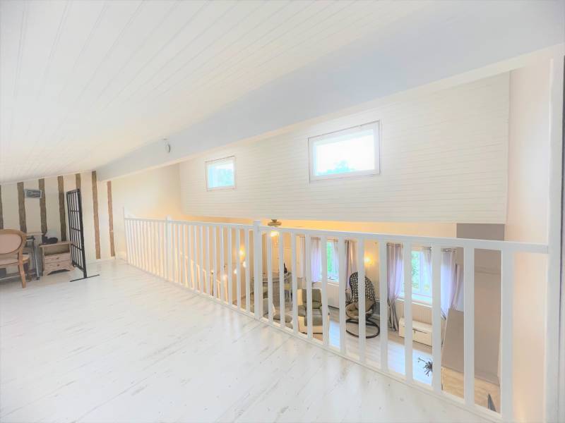 A l'étage, vous trouverez une grande mezzanine, 1 chambre et des combles aménageables.