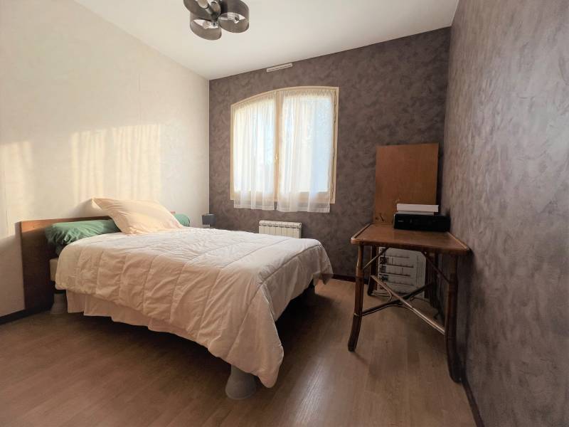 Elle est composée d'une entrée, d'une cuisine équipée et aménagée, d'une salle d'eau, d'un WC séparé, d'un cellier, d'une buanderie pouvant faire office de bureau menant à un débarras et à une cave, de 3 chambres (9m², 12m² et 14m²) et d'un beau salon/séjour lumineux équipée d'une cheminée.