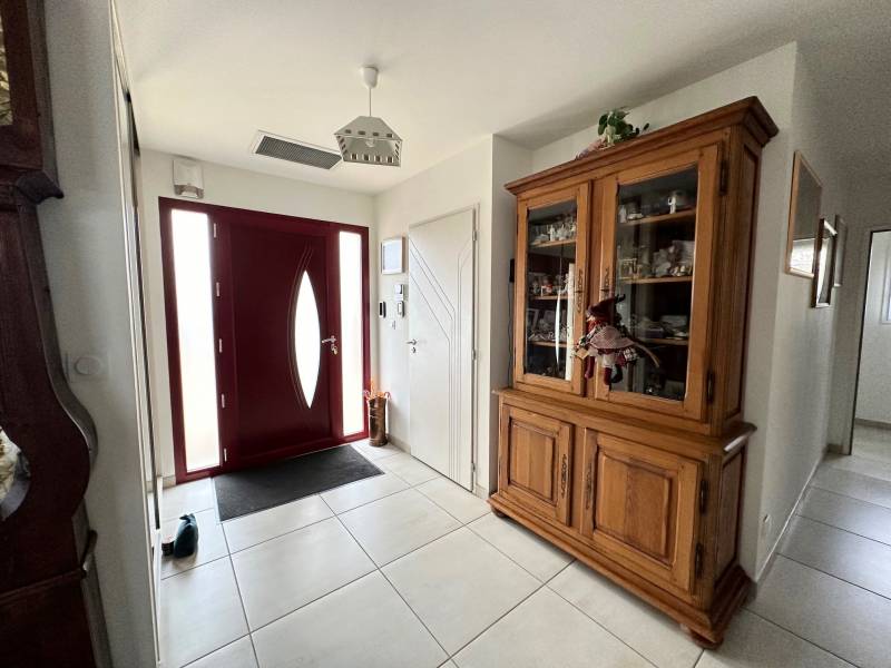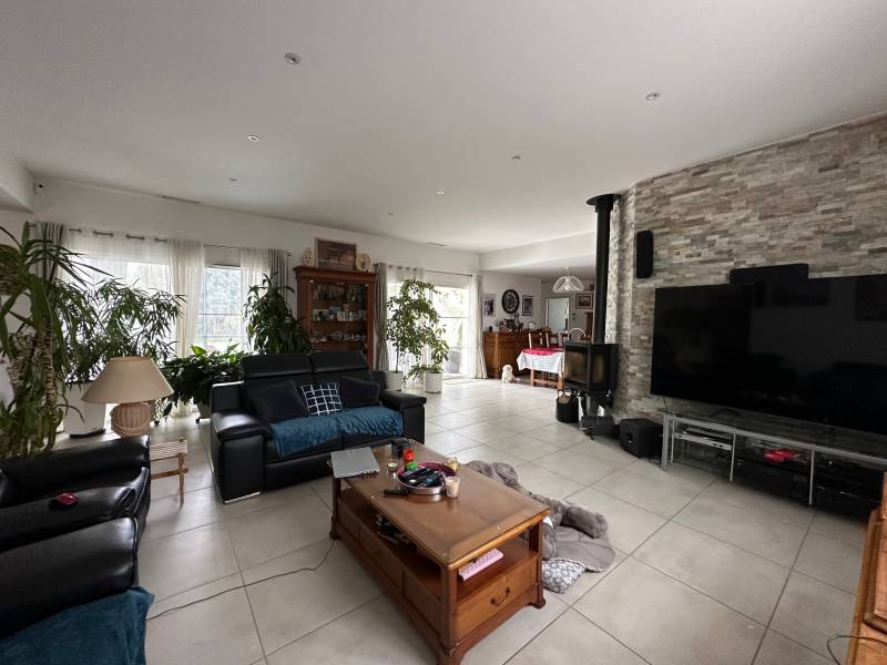 Entrée avec vestiaire, salon spacieux de 67 m² avec poêle à bois, belle cuisine moderne entièrement équipée et ouverte sur la terrasse. Buanderie, cellier et cave à vin.
