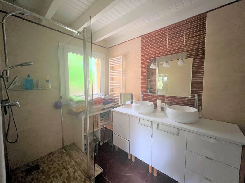 Elle est composée, au rez-de-chaussée, d'une entrée, d'un bureau, d'une salle de bains avec douche et baignoire, d'un wc séparé, d'un coin buanderie, d'une suite parentale, d'une chambre, d'une cuisine aménagée entièrement équipée, d'un salon équipé d'une cheminée avec insert et d'une salle à manger donnant sur une belle véranda prolongée par un agréable extérieur.