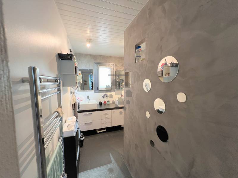 A l'étage un spacieux dégagement, 2 chambres, une salle de douche avec WC et un dressing.