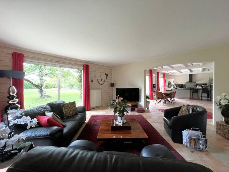 Ainsi que d'un séjour lumineux prolongé d'une agréable terrasse avec piscine donnant sur une magnifique parcelle arborée et paysagée sans vis-à-vis.