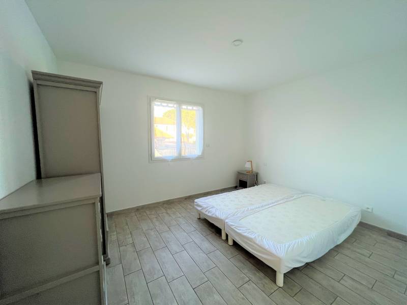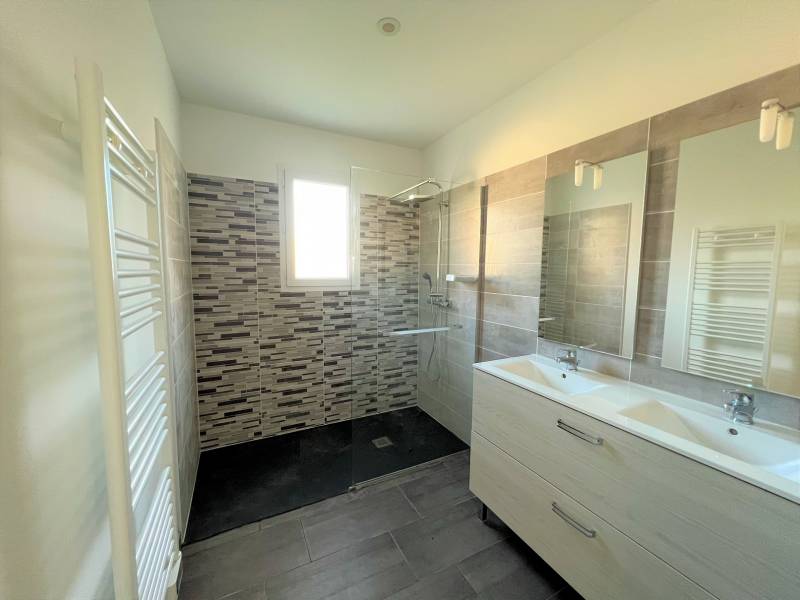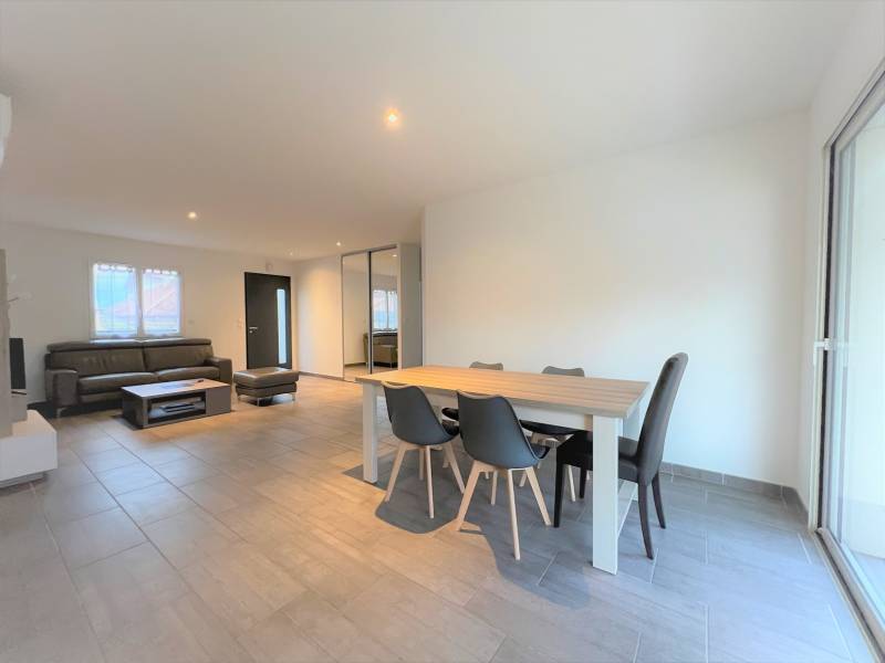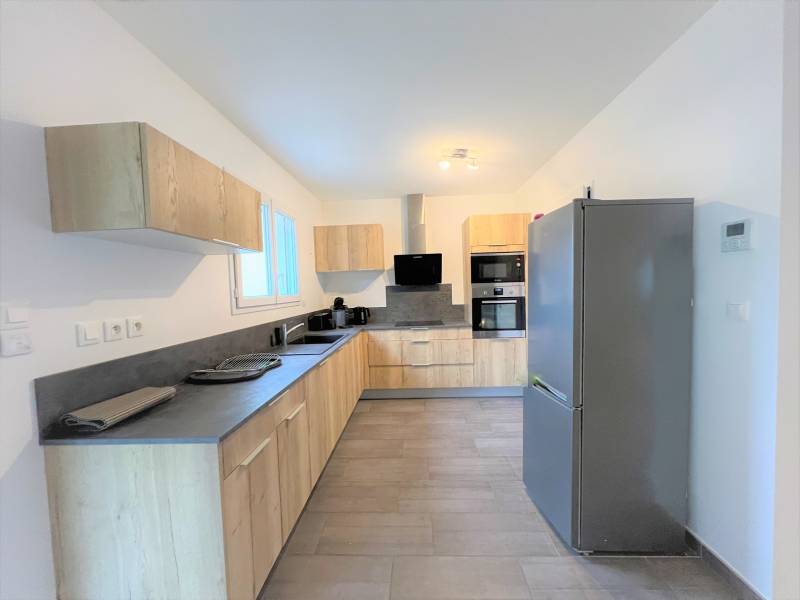 Construite en 2019, cette contemporaine de plain-pied, se compose de trois chambres avec placards (10.4m² ; 10m² et 12,35m²), d'une salle de bains, d'un cellier, d'une cuisine entièrement équipée ouverte sur un salon lumineux donnant sur une agréable terrasse.